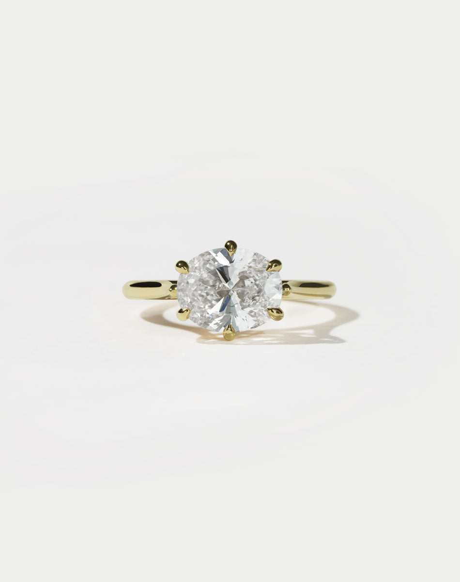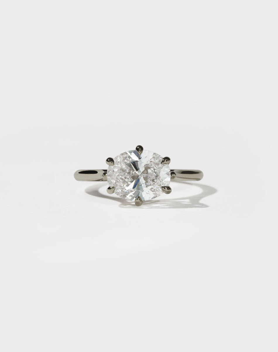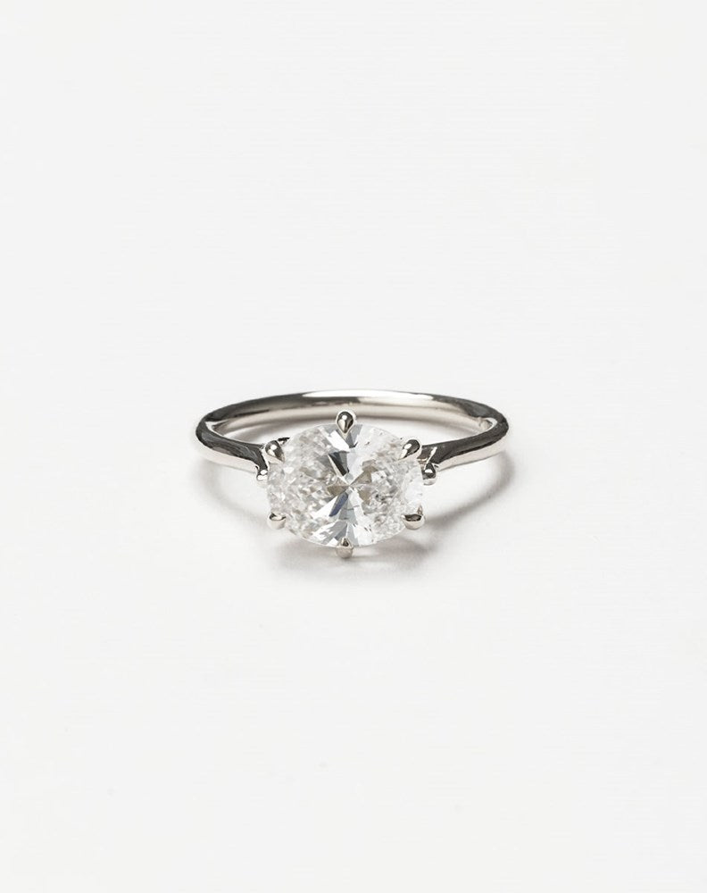 A classic east west oval solitaire engagement ring, set with a white diamond or lab grown diamond in a six claw cathedral setting. The oval cut sits horizontally across the finger, creating a distinctive silhouette that feels both modern and timeless.