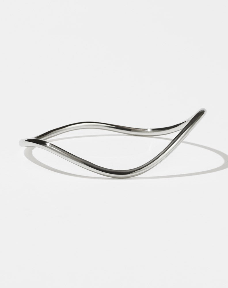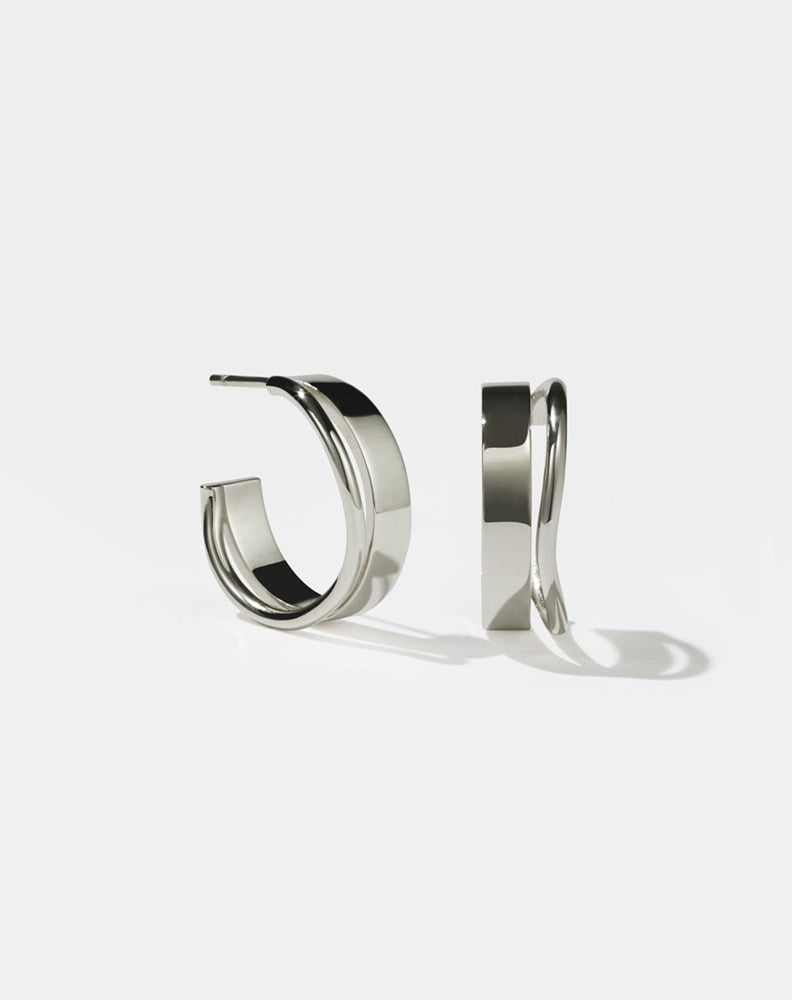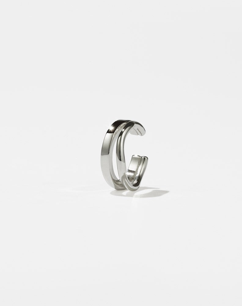 Designed to look like you are wearing two rings. A flat and minimalist band contrasts in elegant balance with an organic and curvy rounded band, to appear as one sleek form embodying an interplay of soft curves against geometric precision.