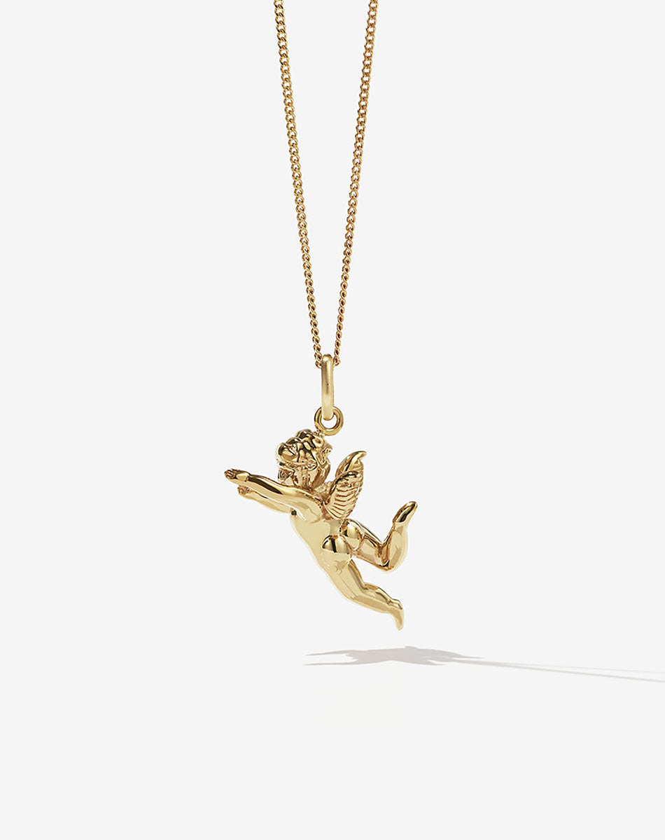 Our small and intricately-sculpted cherub charm, suspended from a minimal signature hoop. Representing divinity, innocence and love at its purest — an everyday talisman for the adored and the adoring.