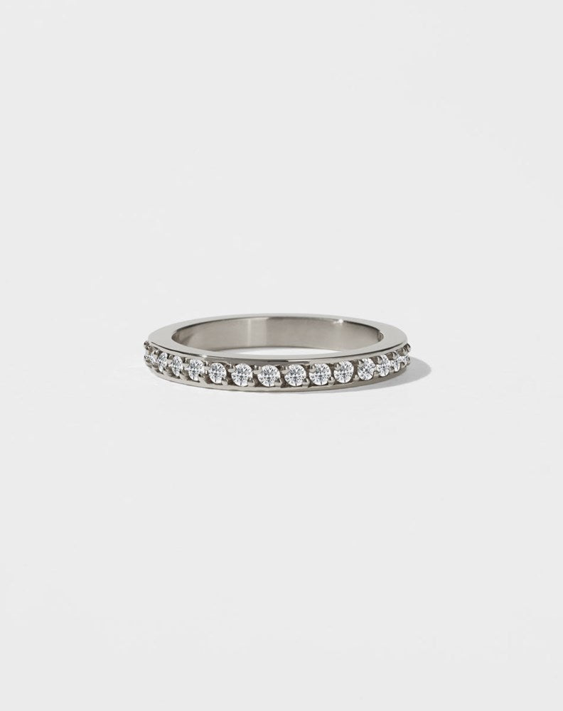 Our favourite and most classic diamond wedding band. This square band is set to halfway with small round brilliant diamonds. Perfect for everyday stacking too. Made in New Zealand in the Meadowlark workshop.
