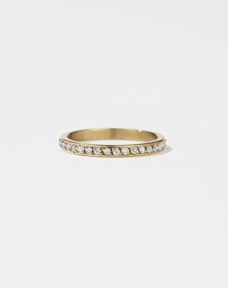 A chunkier version of our favourite and most classic diamond wedding band. This square band is set to halfway with small round brilliant diamonds. Perfect for everyday stacking too. Made in New Zealand in the Meadowlark workshop.