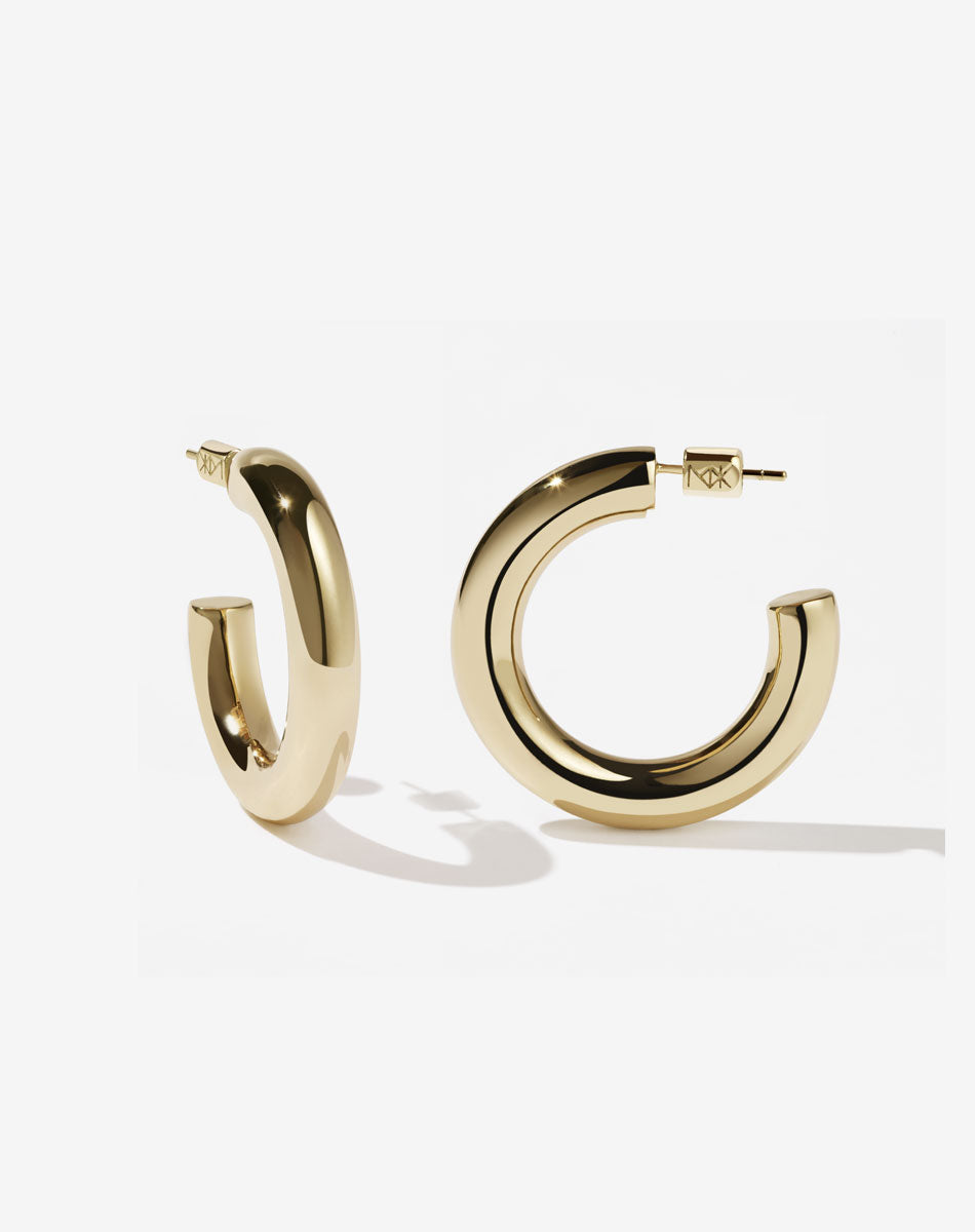 An iconic Meadowlark style featuring a small bud charm, our Revival Hoops appear to be a series of rings suspended on a hoop but are in actuality, entirely solid.