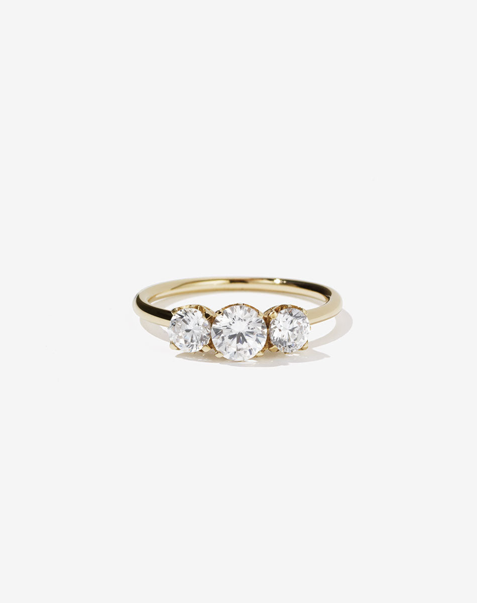 Our classic five stone engagement ring, a timeless design featuring a round brilliant central stone, flanked by two ascending round brilliant stones on each side. Set into our signature Meadowlark setting, featuring graphic lines inspired by our insignia. Finished with a fine round band. This ring is made in New Zealand in the Meadowlark Auckland based workshop.